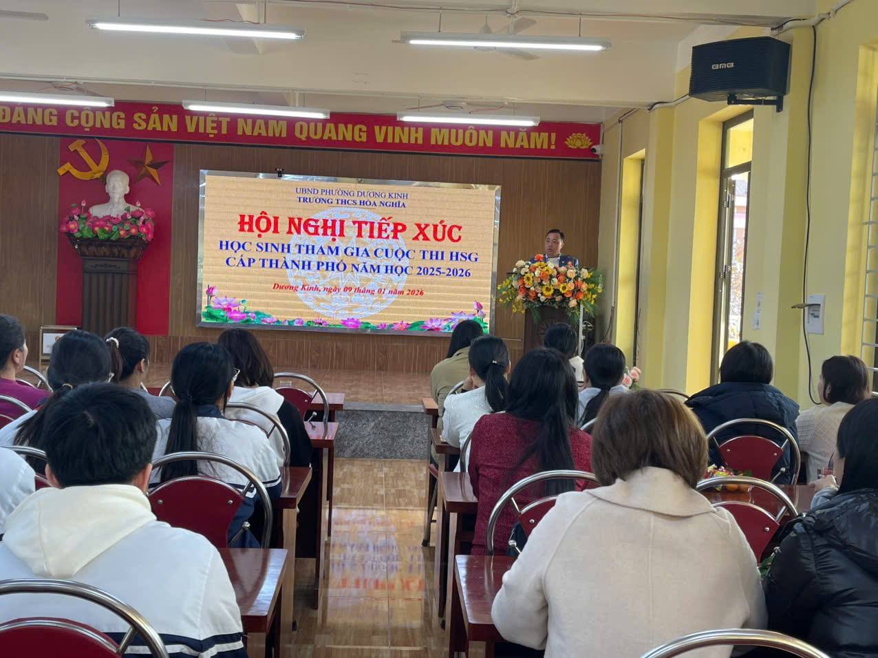 Thực hiện kế hoạch của Sở Giáo dục và Đào tạo Hải Phòng về việc tổ chức cuộc thi HSG lớp 9 các môn văn hóa và môn cờ vua cấp thành phố năm học 2025-2026. Ngày 09/1, trường THCS Hòa Nghĩa tổ chức tiếp xúc các đội tuyển HSG với sự có mặt của BGH, GVCN, GV ôn thi, 19 em HSG, PHHS có con tham gia thI. Thay mặt nhà trường, BGH đã triển khai các nội dung liên quan đến cuộc thi, ý kiến động viên của PHHS, ý kiến động viên của GV ôn thi, ý kiến quyết tâm của học sinh thi. Chúc các em mạnh khỏe và bình tĩnh, đạt kết quả cao.