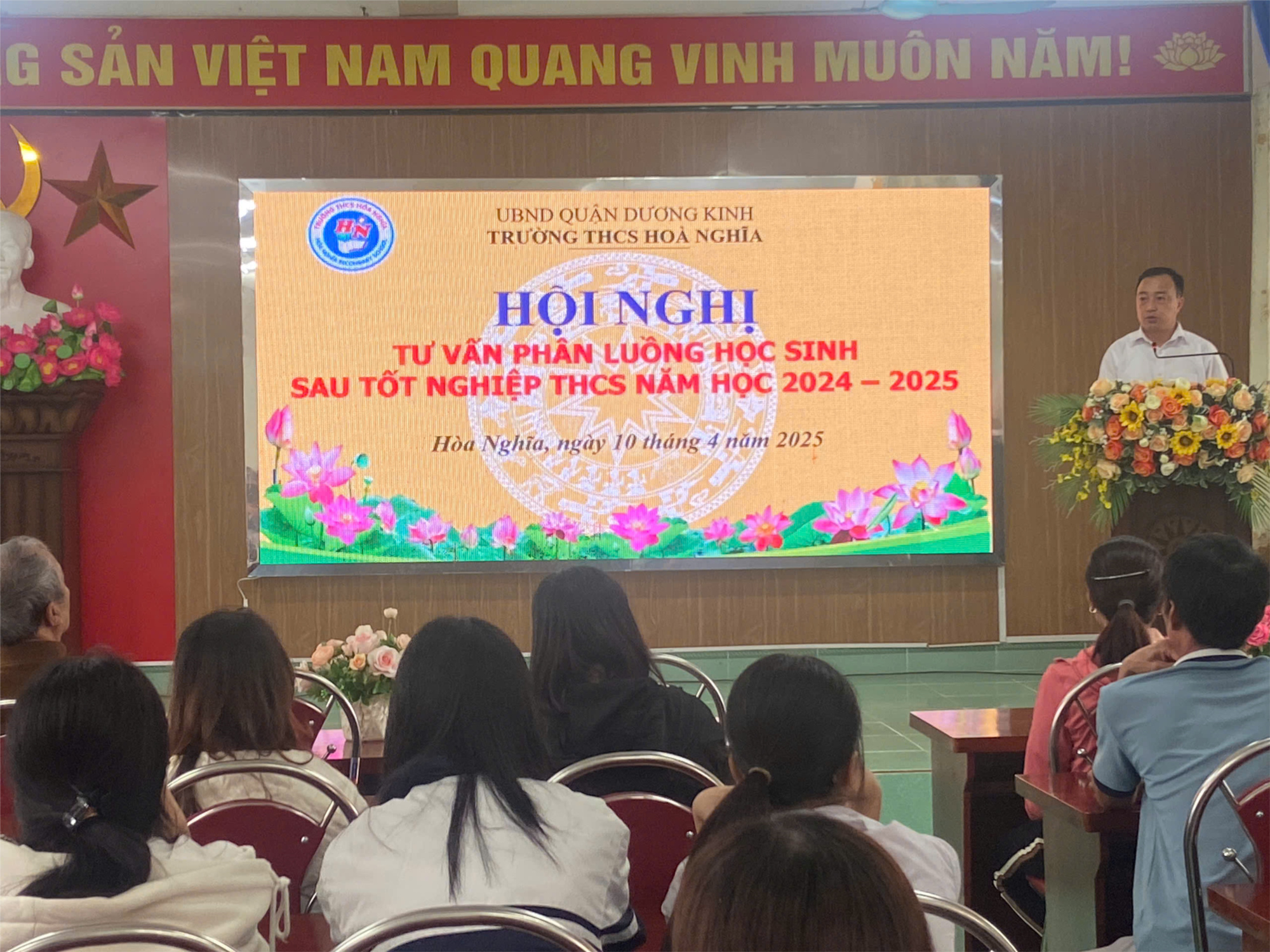 Thực hiện Kế hoạch năm học 2024-2025, Nhằm định hướng nghề nghiệp và hỗ trợ học sinh lựa chọn con đường phù hợp sau khi tốt nghiệp THCS, Chiều ngày 10/4/2025, Trường THCS Hòa Nghĩa đã tổ chức Hội nghị tư vấn phân luồng cho học sinh lớp 9 sau tốt nghiệp THCS. Chủ trì hội nghị là thầy Nguyễn Đức Nam - Bí thư chi bộ - Hiệu trưởng nhà trường. Thành phần tham dự hội nghị gồm: Các thầy cô giáo là GVCN lớp 9, giáo viên dạy môn Toán, Văn, Tiếng Anh lớp 9, các bậc phụ huynh và học sinh lớp 9B,9C,9D,9E.