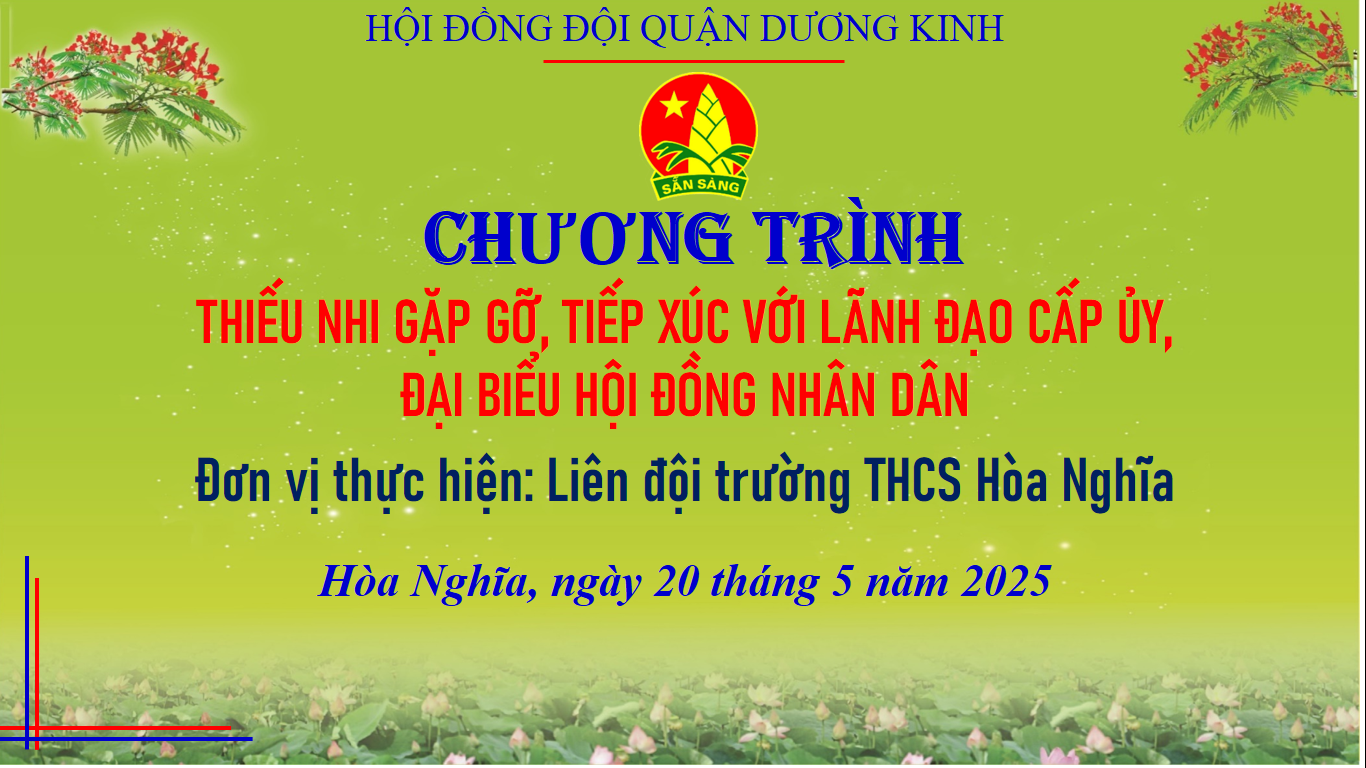 Thực hiện chương trình công tác Đội và phong trào thiếu nhi năm học 2024–2025, chiều ngày 20 tháng 5 năm 2025, Ban Thường vụ Đoàn - Hội đồng Đội Quận Dương Kinh triển khai Chương trình điểm “Thiếu nhi gặp gỡ, tiếp xúc với Lãnh đạo cấp ủy, Đại biểu Hội đồng nhân dân” tại Liên đội THCS Hòa Nghĩa.